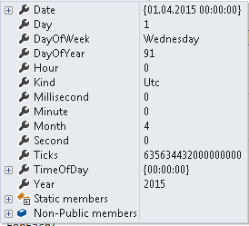 If we look at the two dates in details we see that both say it is 1st April 2015. We also see an important thing Ticks. This says the number of ticks since 0:00:00 UTC on 1st Jan, 0001. 1 millisecond = 10, 000 ticks.