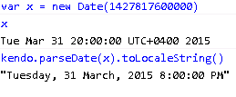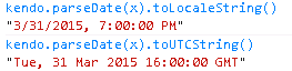 We can as well use Kendo functions and the output will be like below. The toLocaleString gives 12:00:00 AM. There is nothing to worry about here. If the time component is absent then the function assumes 12 AM midnight, essentially means the first moment of that day.