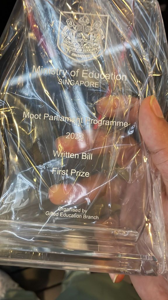 My Son, Pranjal’s 5-member team from NUS High School gets their bill “passed” in Singapore Moot Parliament (First Prize in Written Bill).